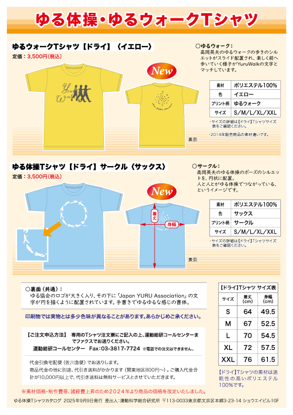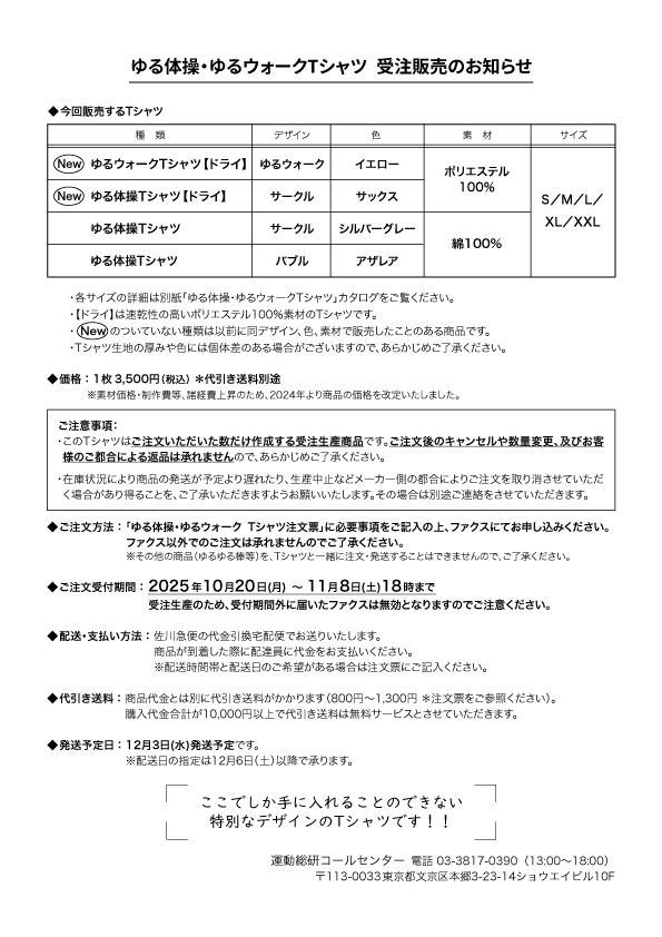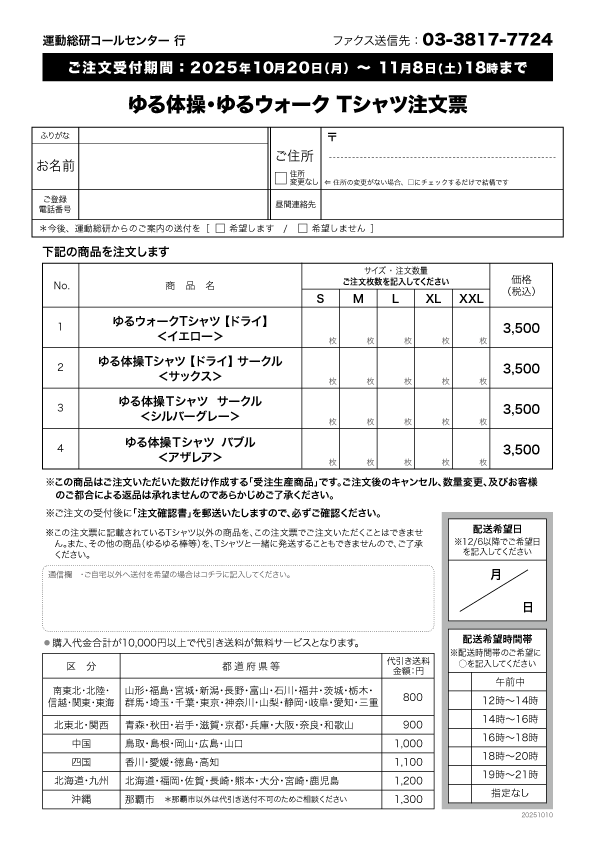 ・ご注文は「ゆる体操・ゆるウォークTシャツ注文票」に必要事項をご記入いただきファクスでお送りください(お電話での注文はお受けしておりません)。