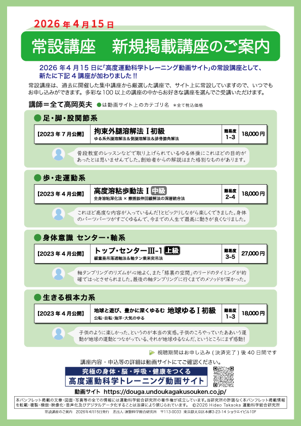 常設講座は過去に開催した高岡英夫指導の集中講座から厳選した、常に動画サイトに掲載(常設)している講座です。