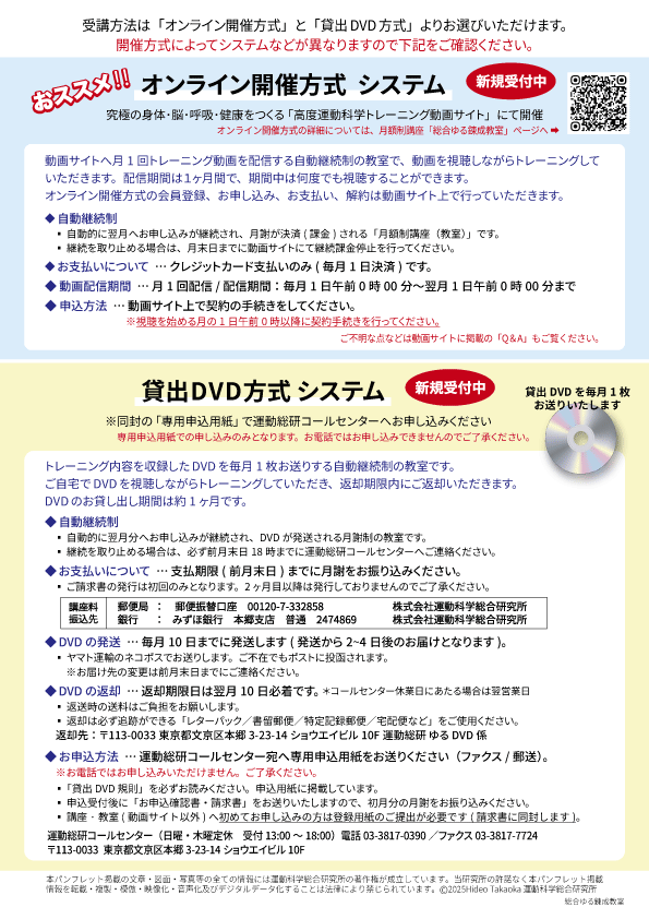 お申し込み方法 | 究極の身体・脳・呼吸・健康をつくる 高度運動科学トレーニング動画サイト上でのお申し込みとなります。 月額制講座「総合ゆる錬成教室」のお申し込みは こちらから >> |