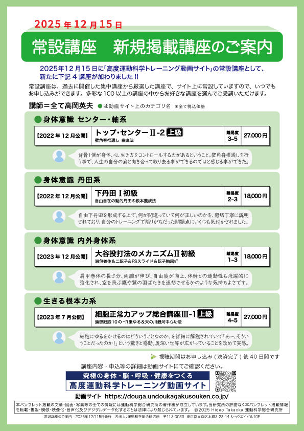 常設講座は過去に開催した高岡英夫指導の集中講座から厳選した、常に動画サイトに掲載(常設)している講座です。